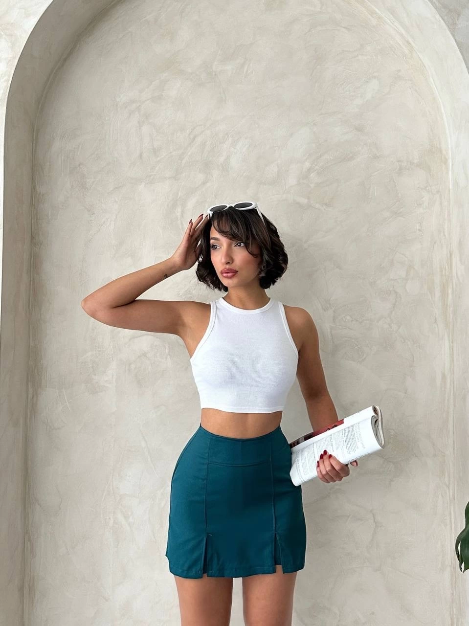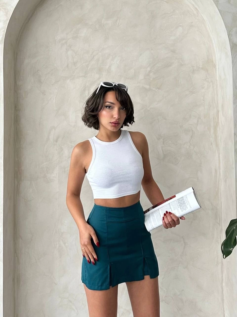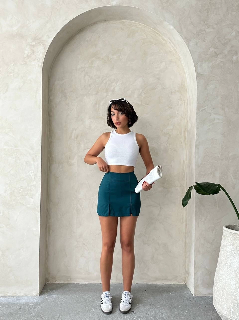 Çift yırtmaçlı atlas şort etek petrol yeşili s240364