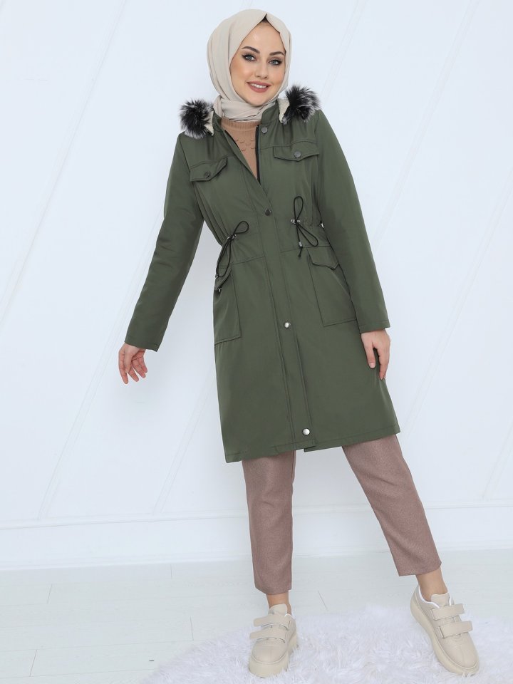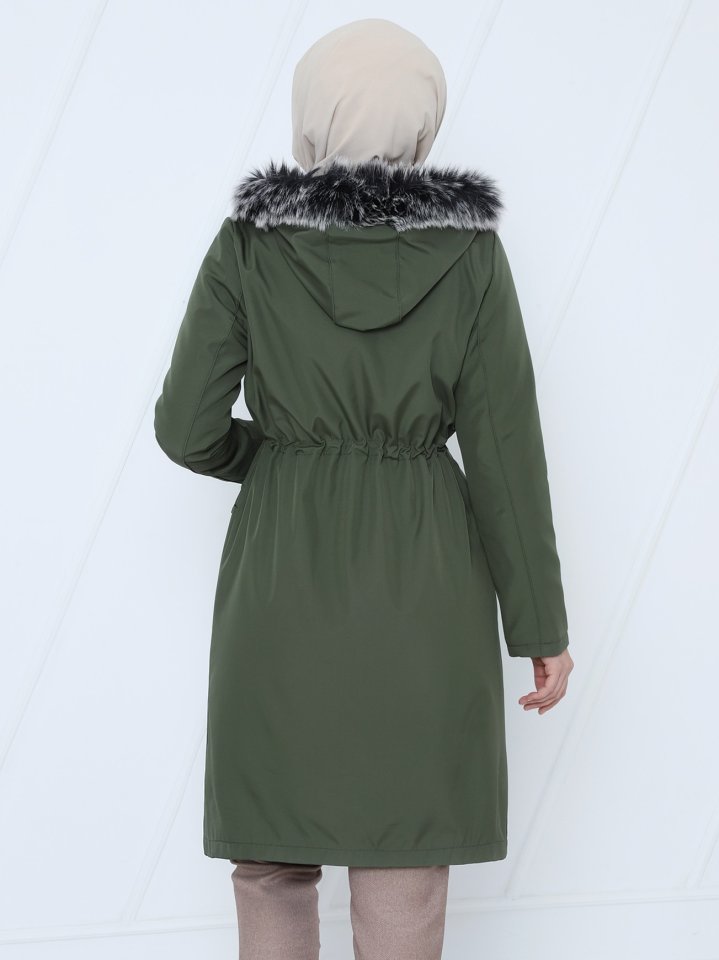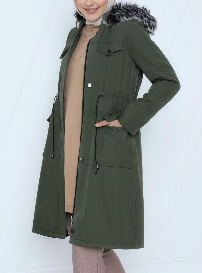 Çıkma Kapşonlu Bağcıklı Bondit Kısa Kaban -Haki