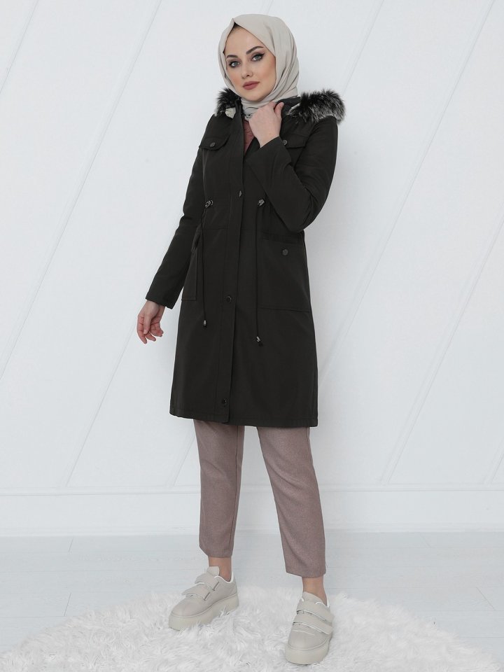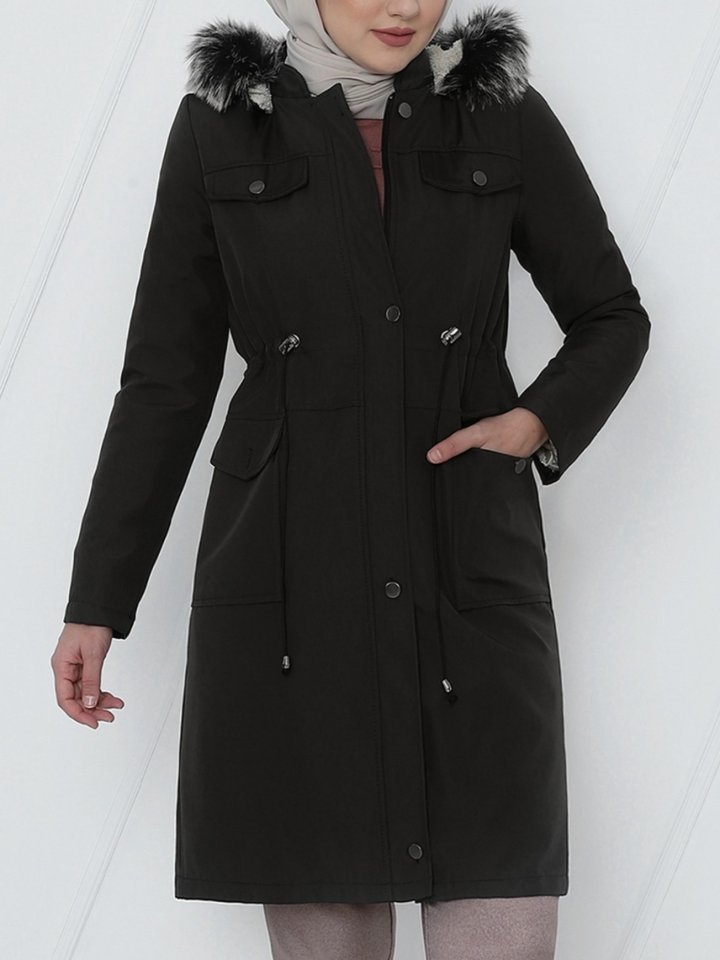 Çıkma Kapşonlu Bağcıklı Bondit Kısa Kaban -Siyah