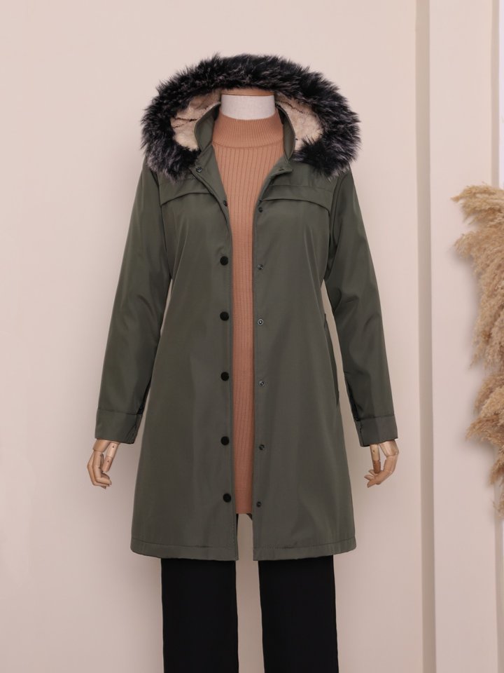 Çıkma Kapşonlu Çıtçıtlı Cepli Kısa Kaban -Haki