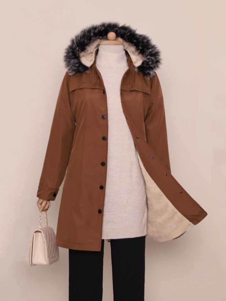 Çıkma Kapşonlu Çıtçıtlı Cepli Kısa Kaban -Taba