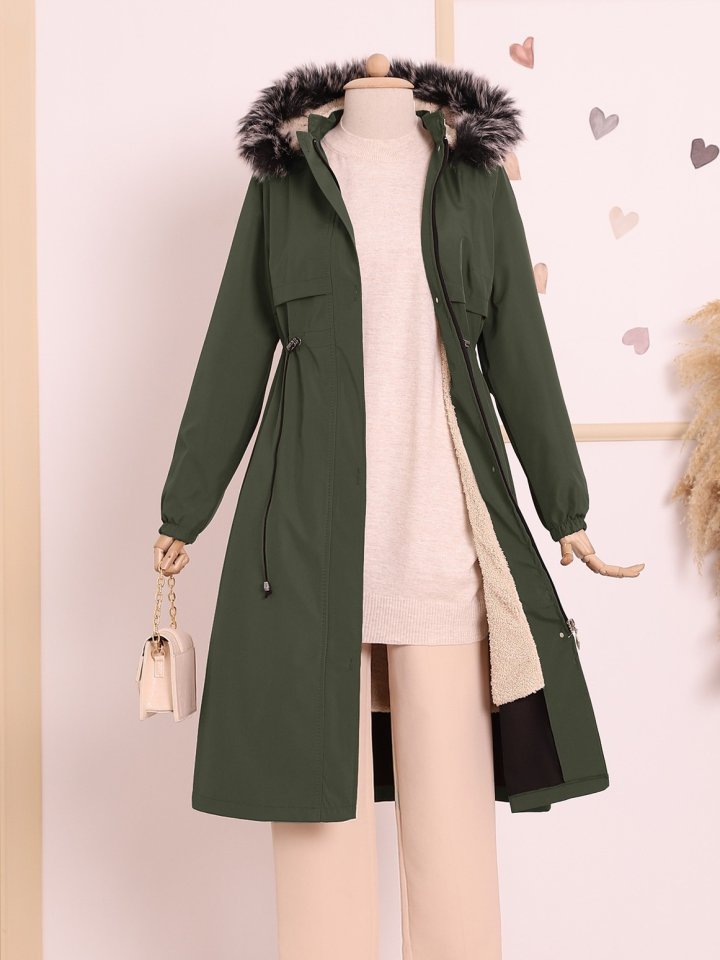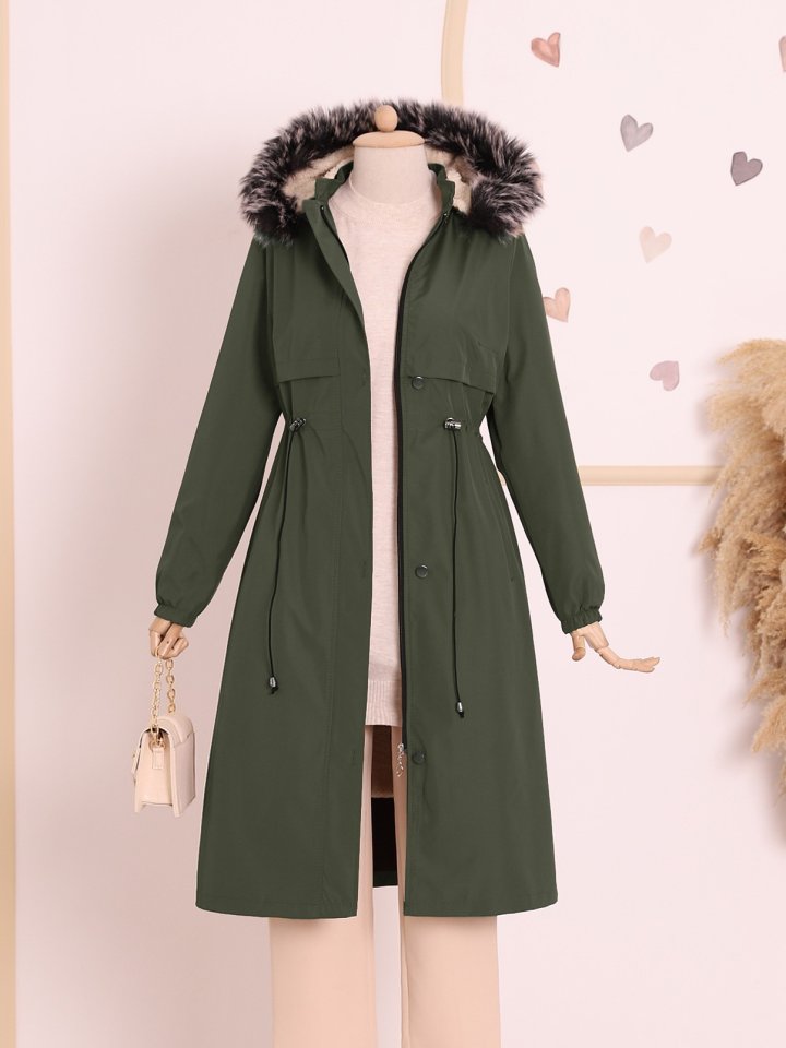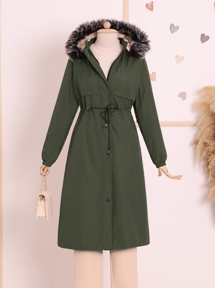 Çıkma Kapşonlu Tünel Bağcıklı Bondit Kaban -Haki