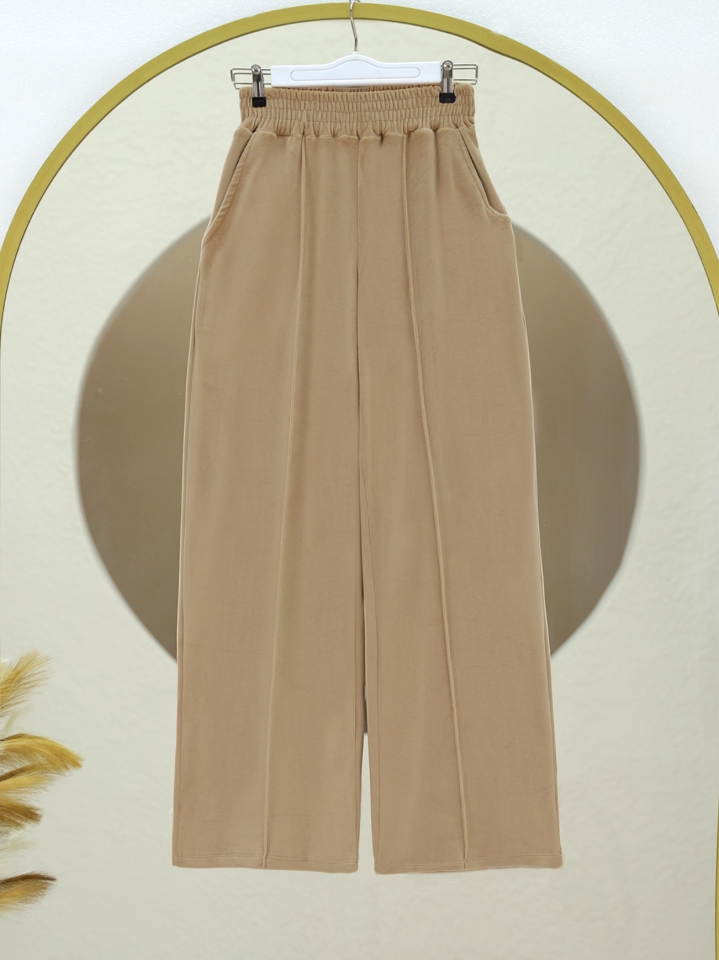 Çımalı Beli Lastikli Kadife Pantolon -Vizon
