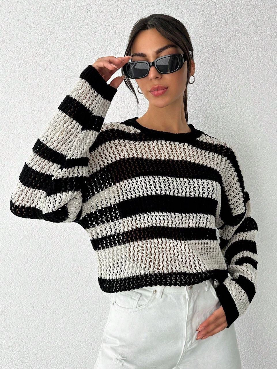 Çizgili bisiklet yaka triko kazak beyazsiyah