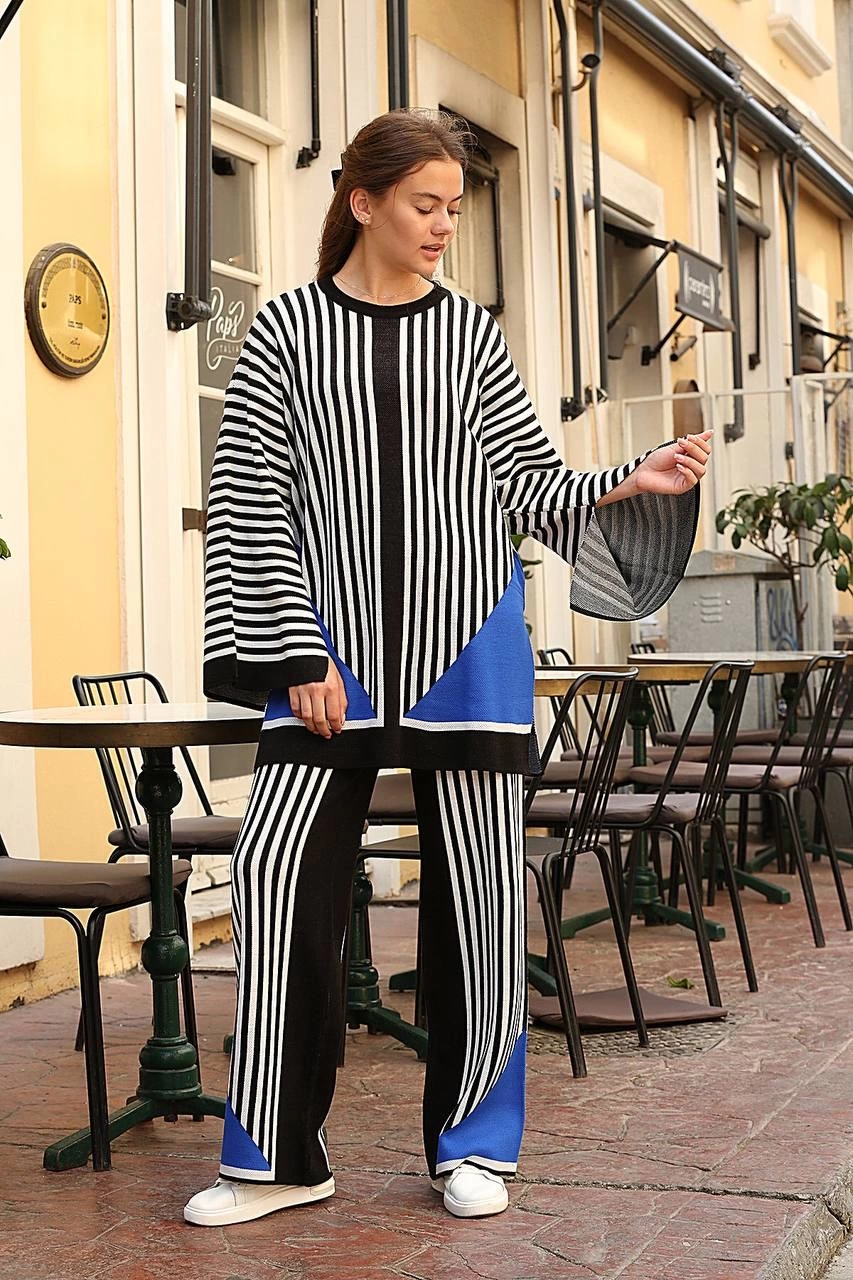 Çizgili bisiklet yaka triko takım siyah