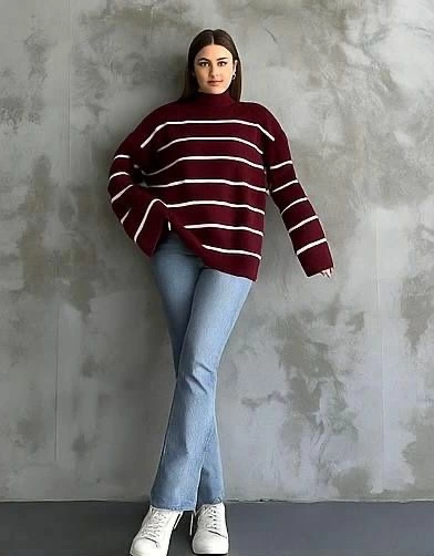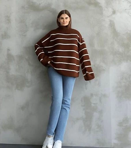 Çizgili ispanyol kol triko boğazlı kahve beyaz elf