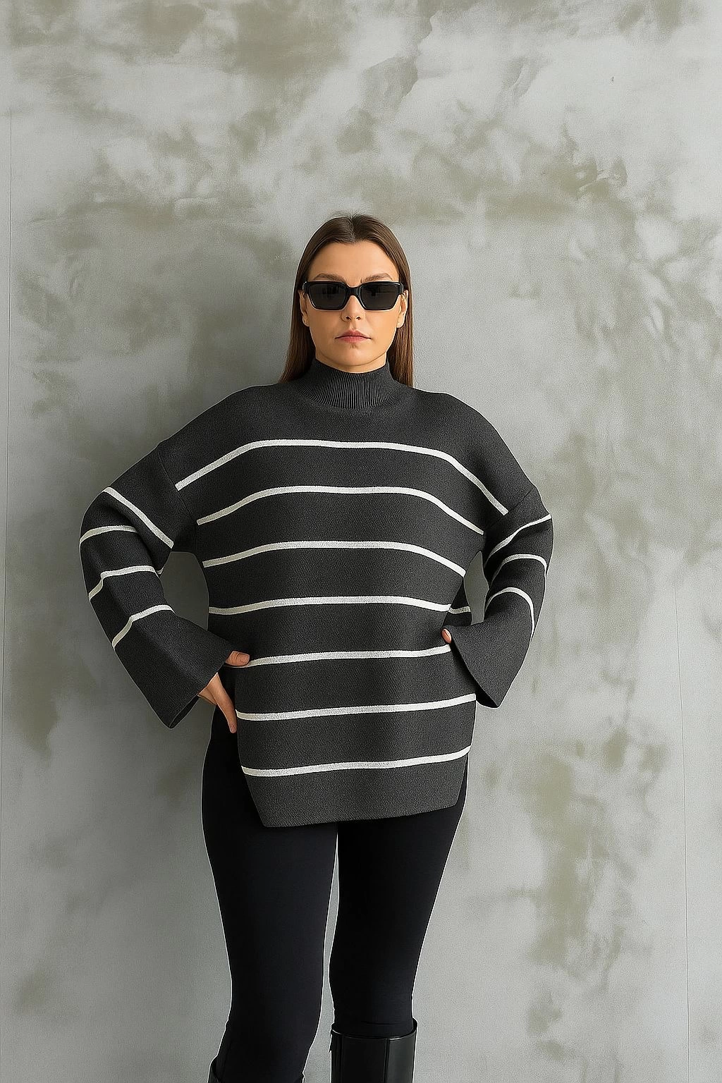 Çizgili ispanyol kol triko boğazlı kazak antrasit elf