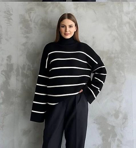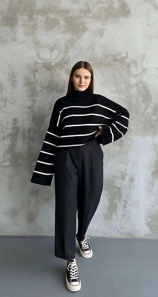 Çizgili ispanyol kol triko boğazlı kazak siyah elf