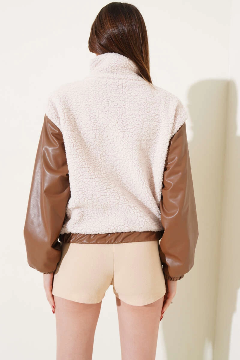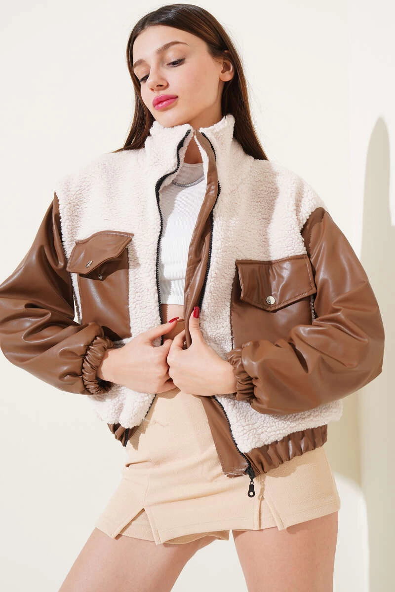 Deri garnili cepli peluş mont taba t1253