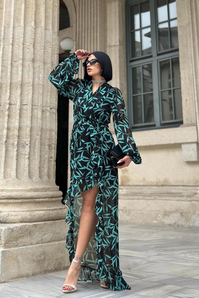 Kadın Uzun Kollu Kruvaze Yaka Büzgü Ve Balon Kol Detay Krep Kumaş Maxi Boy Elbise