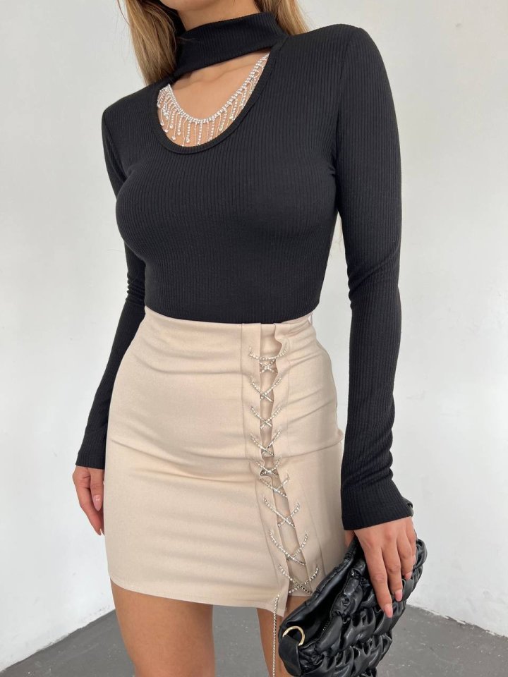 Dik Yaka Taş Detaylı Uzun Kol Bluz -Siyah