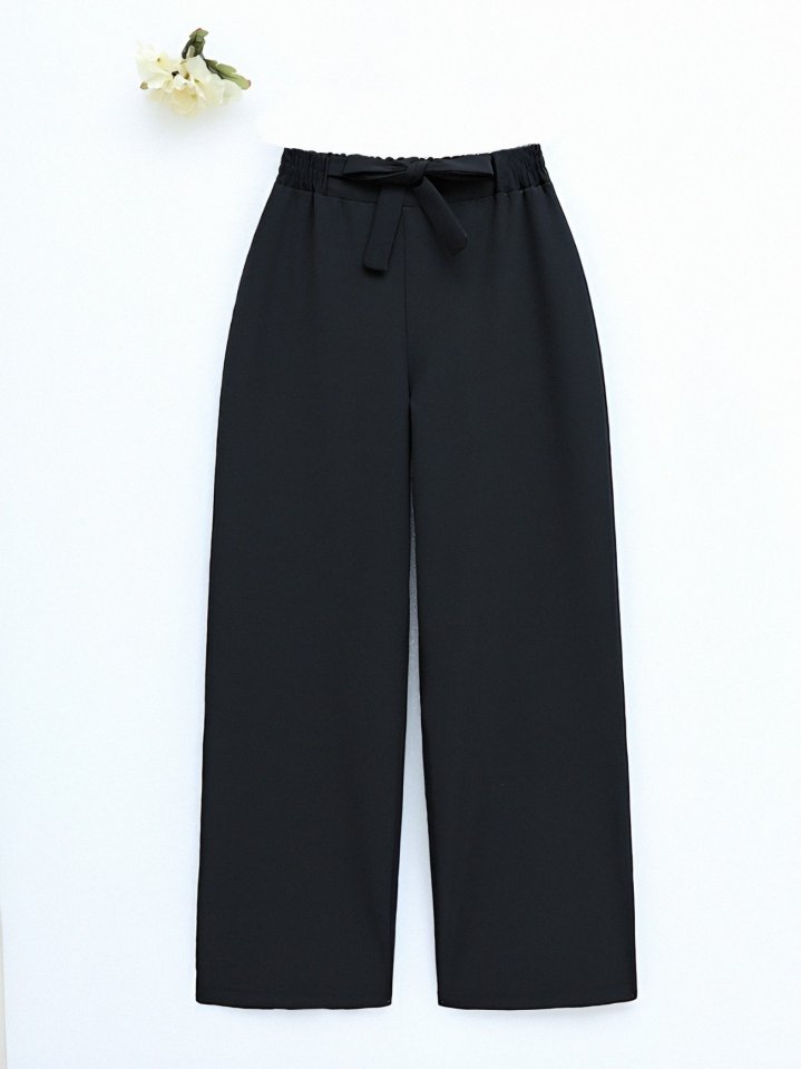 Duble Kumaş Beli Kuşaklı Bol Paça Pantolon -Siyah