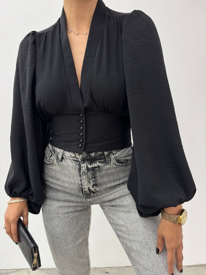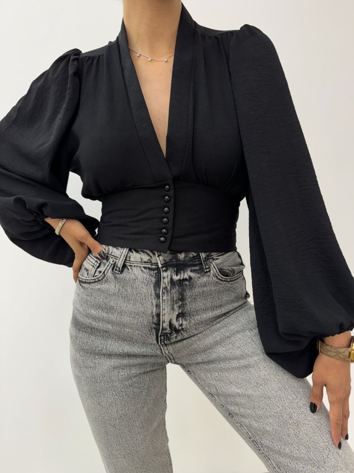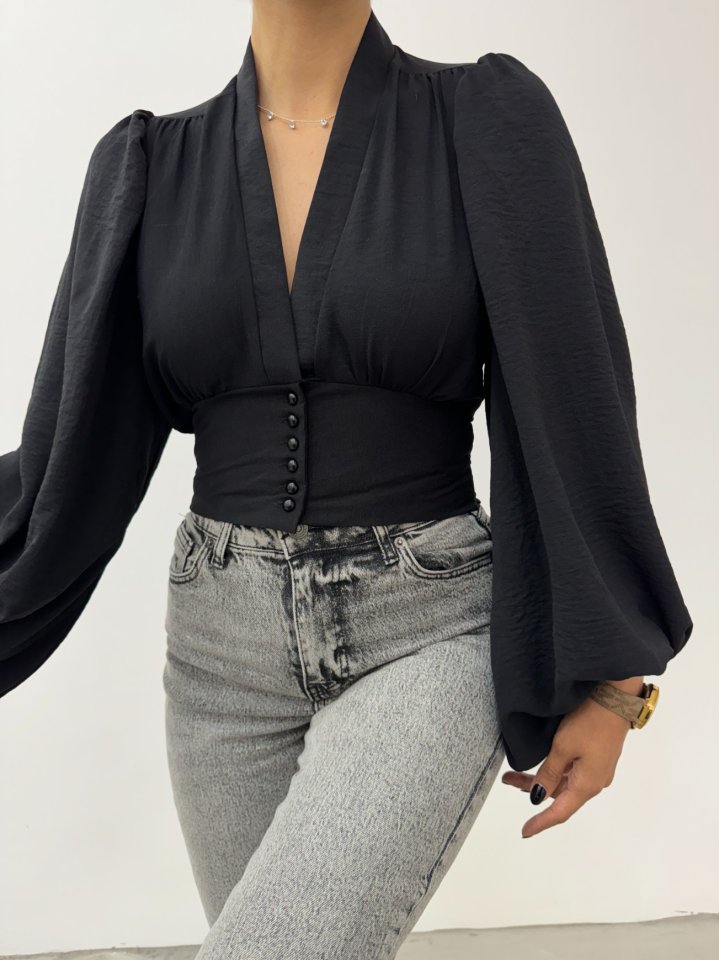 Düğmeli Arkası Lastikli Balon Kol Sandy Crop -Siyah