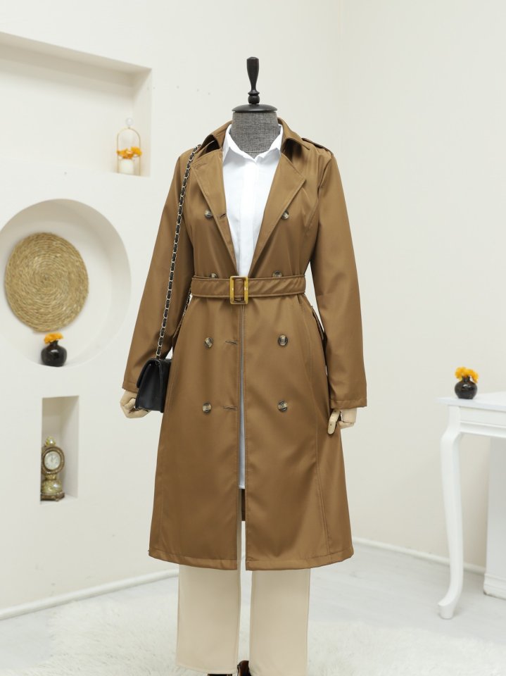 Düğmeli Kemerli Ara Boy Trençkot -Taba