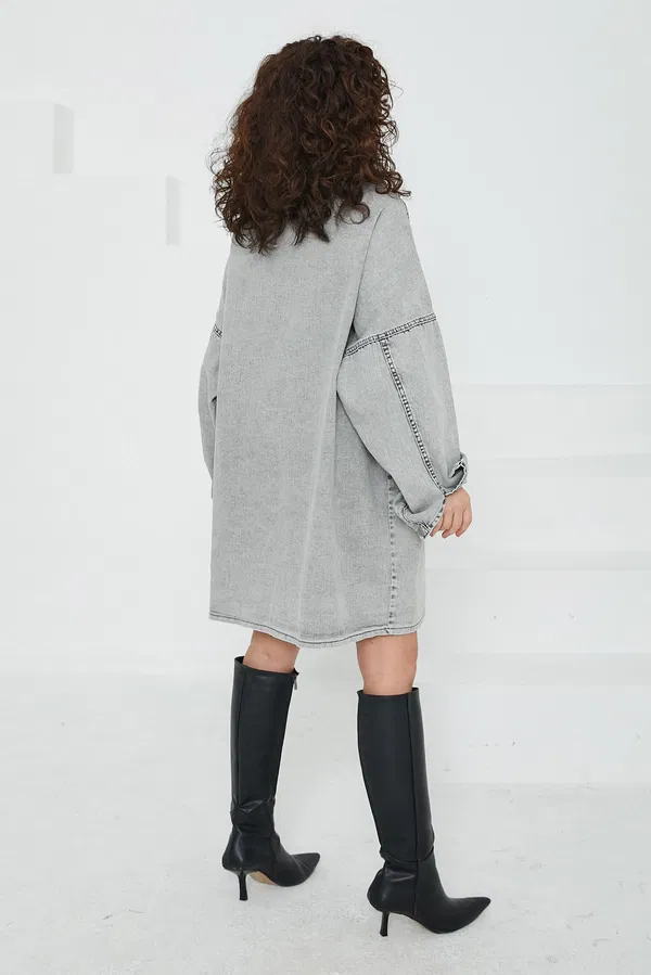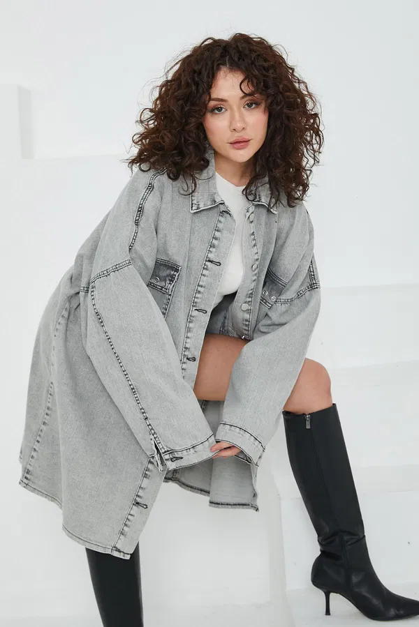 Düz Gömlek Yaka Kadın Gri Kuş Gözü Cepli Kot Ceket