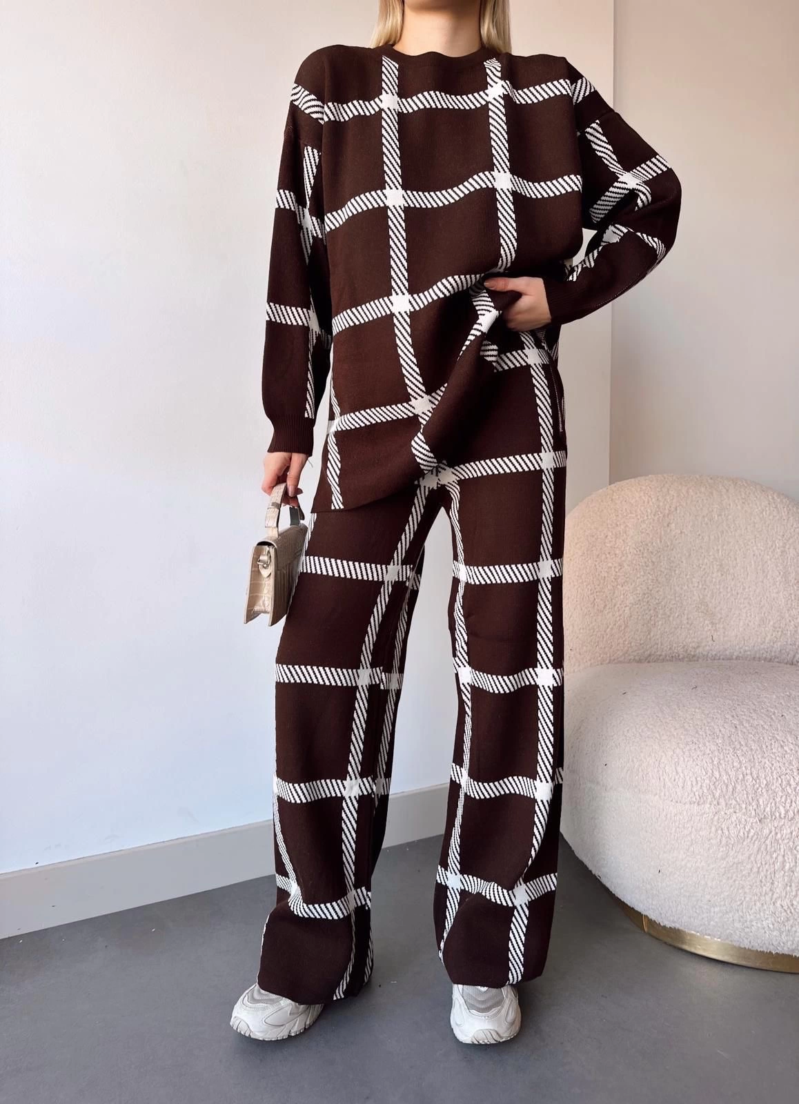 Ekoseli triko takım kahvebeyaz