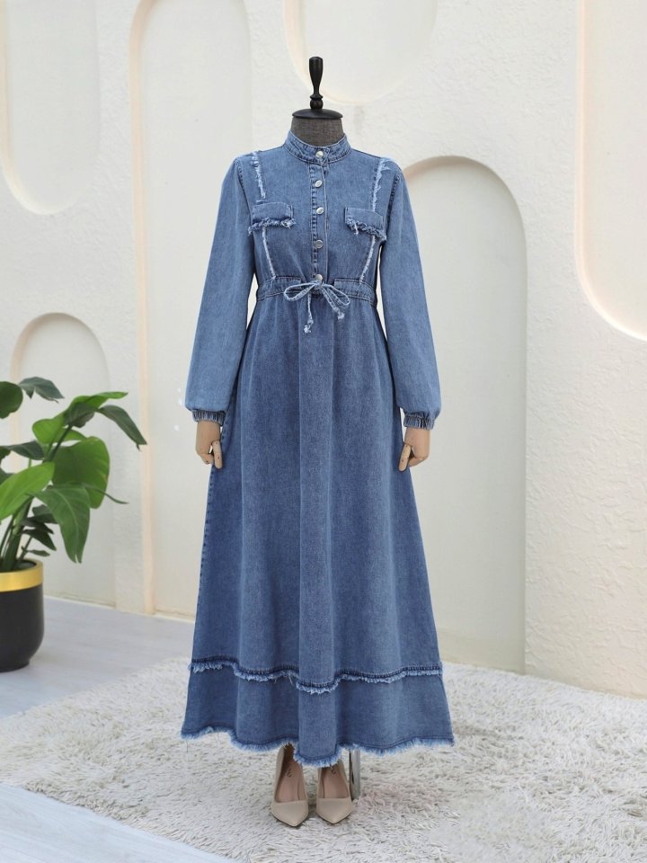 Eteği Püsküllü Tünel Bağcıklı Kot Elbise -Buz Mavi