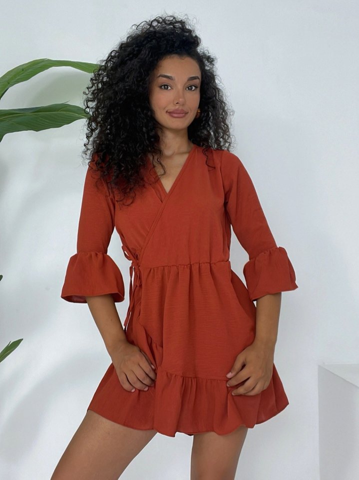Eteği Ve Kolları Fırfırlı Beli Lastikli Ayrobin Elbise -Kiremit