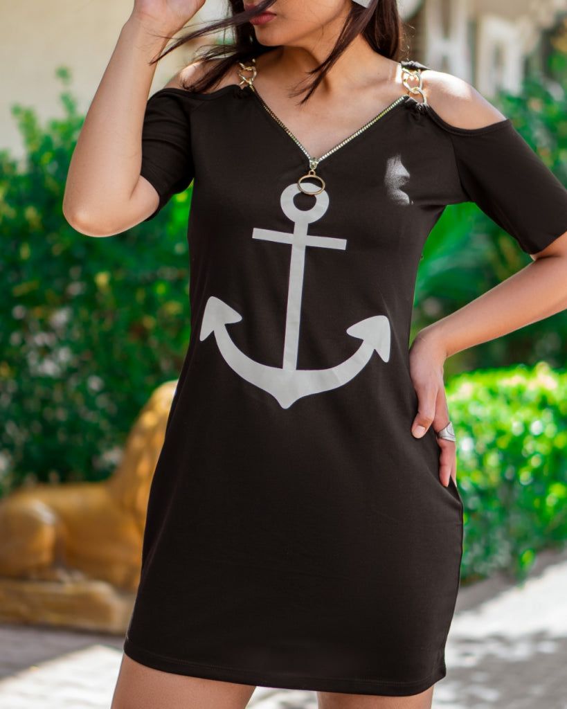 Fermuar Detay çıpa Baskılı Zincir Askılı Viskon Elbise