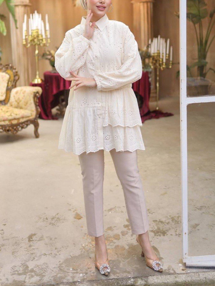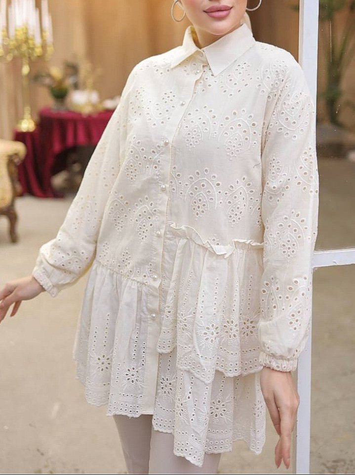 Fırfır Ve Fisto Detaylı İnci Düğmeli Gömlek -Bej