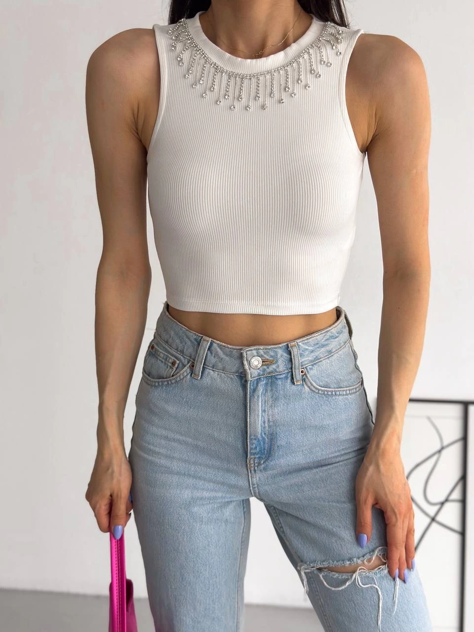 Fitilli kaşkorse detayıyla şıklığına şıklık katan beyaz atlet. İnce zincir detayıyla tarzınızı tamamlayın.