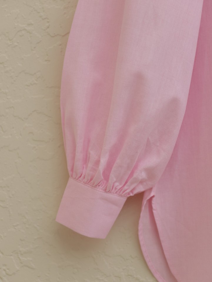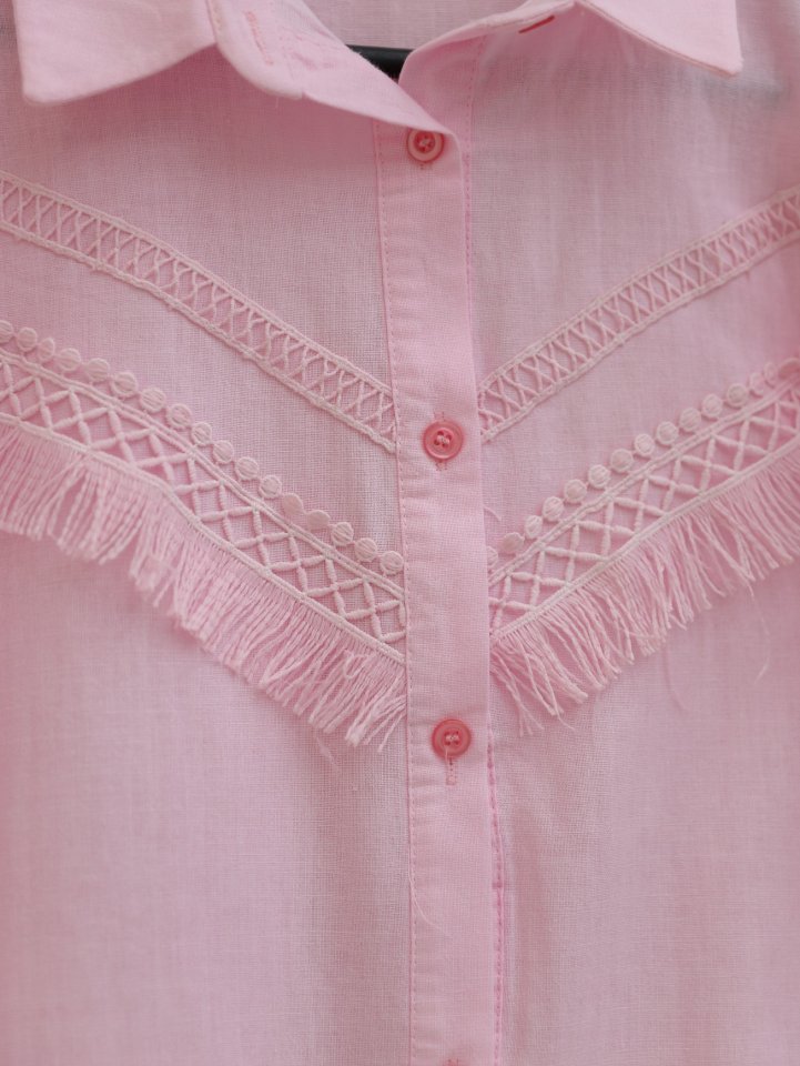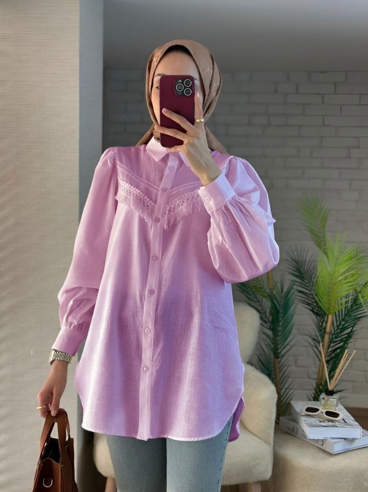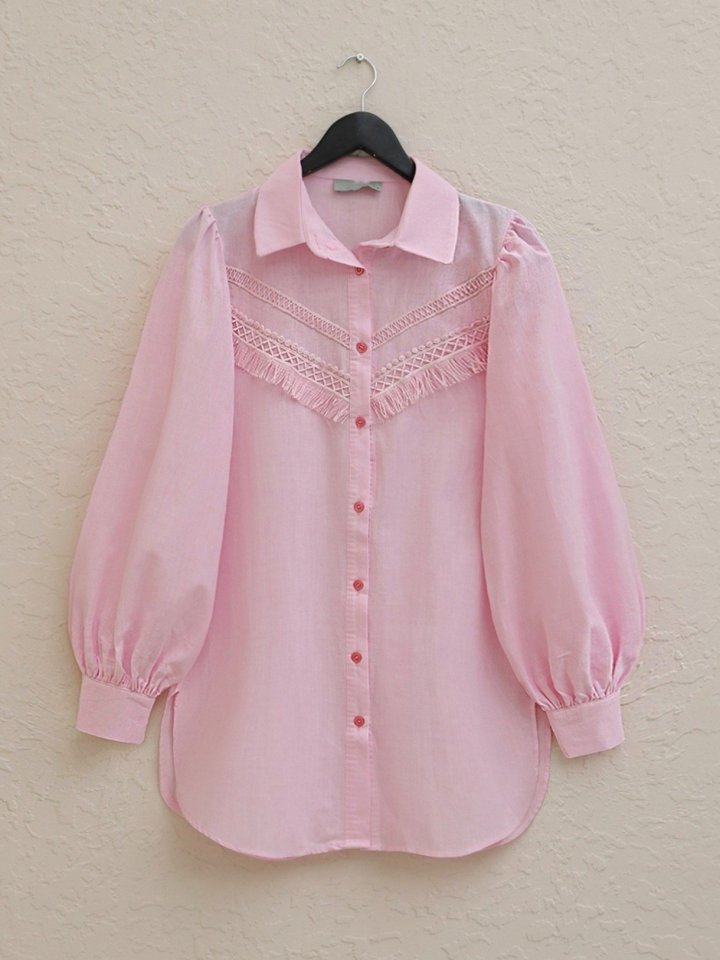 Güpür Püsküllü Ham Keten Balon Kol Gömlek -Pudra