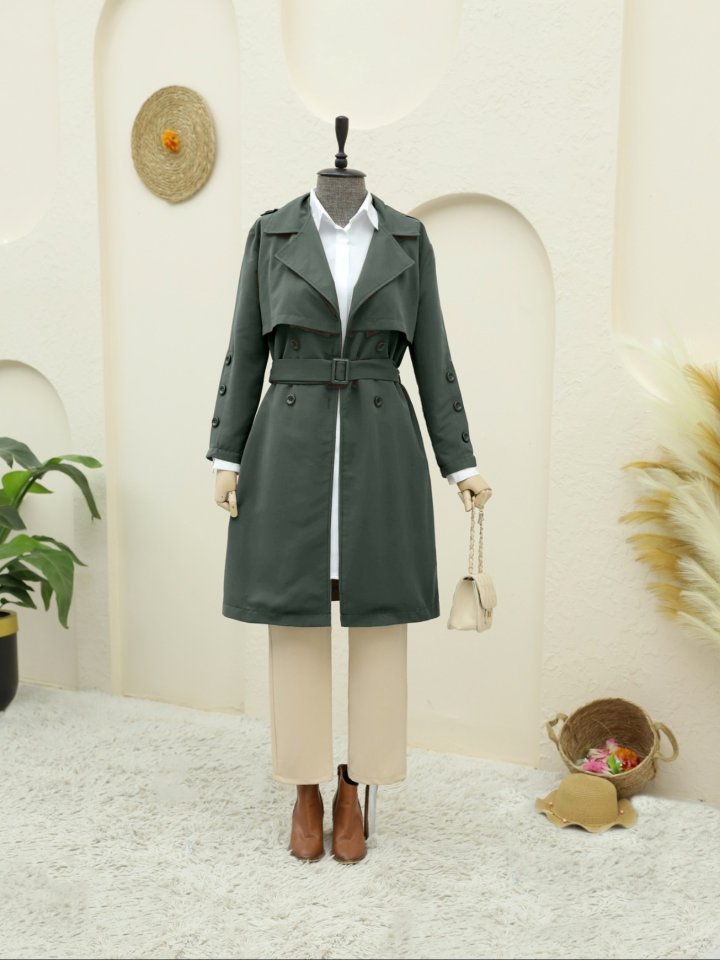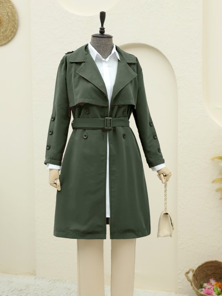İç Astarlı Düğmeli Kemerli Trençkot -Haki
