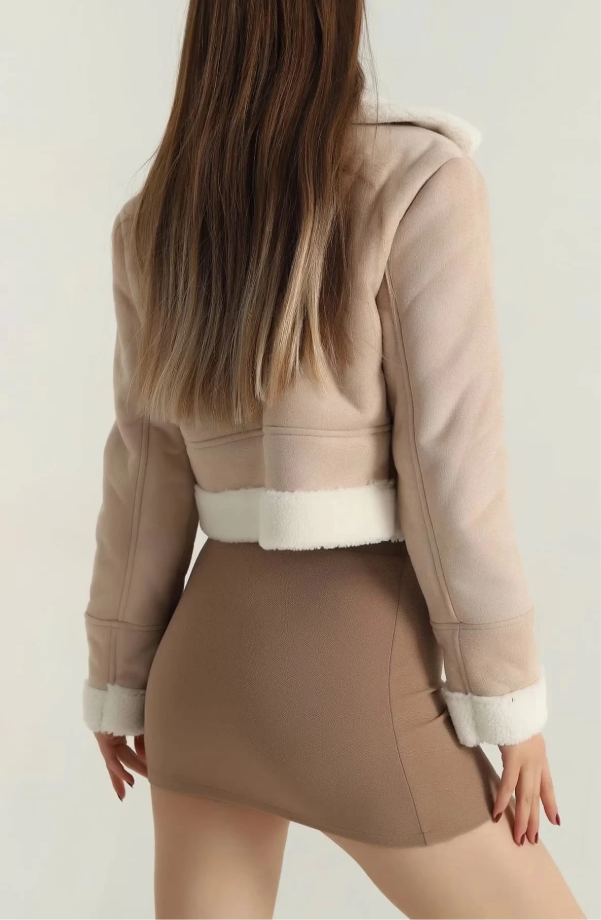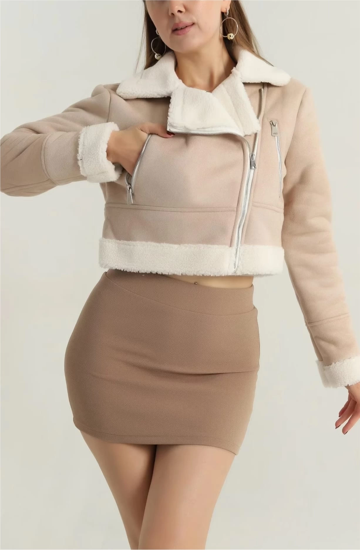 İçi kürklü dışı süet kısa kaban bej t1186