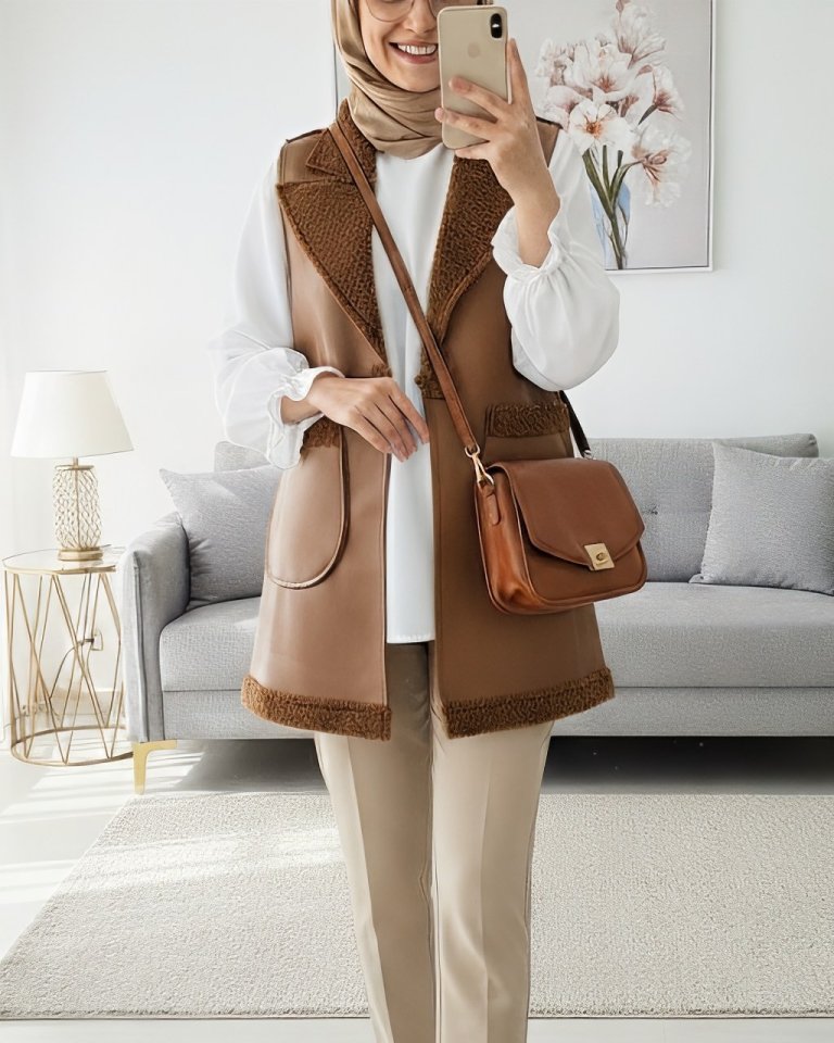 İçi Kuzu Peluş Çift Cepli Yelek -Taba