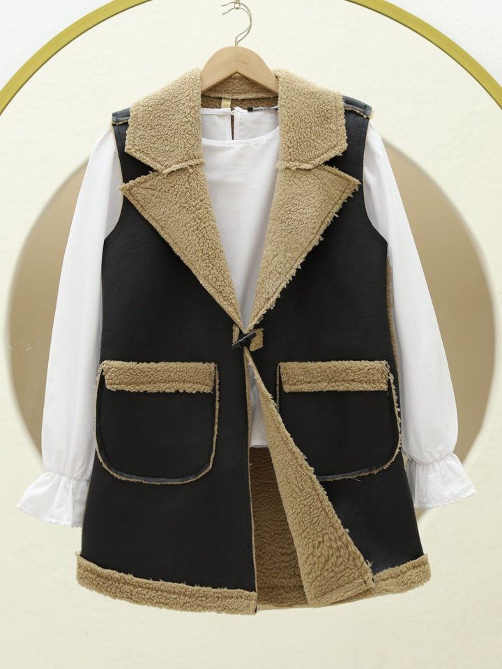İçi Kuzu Peluş Çift Cepli Yelek -Vizon