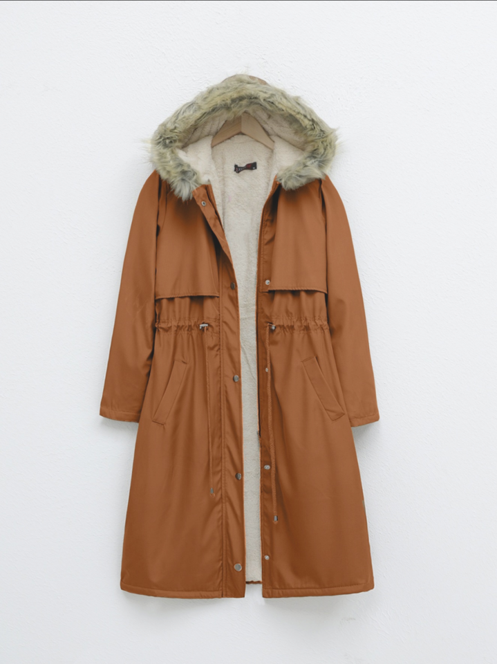 İçi Peluşlu Sabit Kapşonlu Tünel Bağcıklı Uzun Mont -Hardal