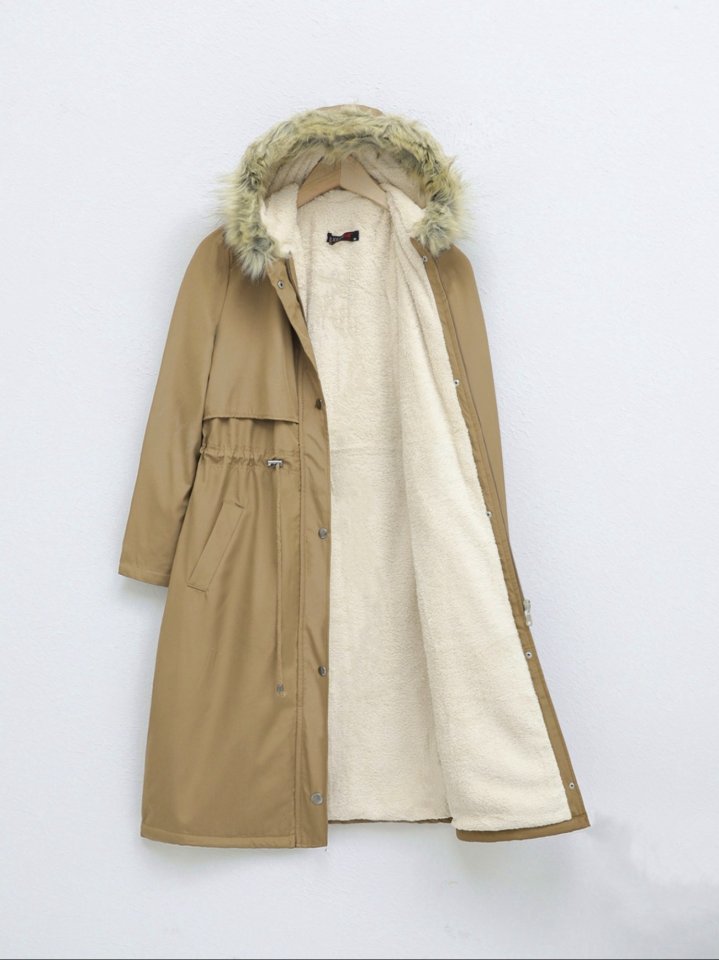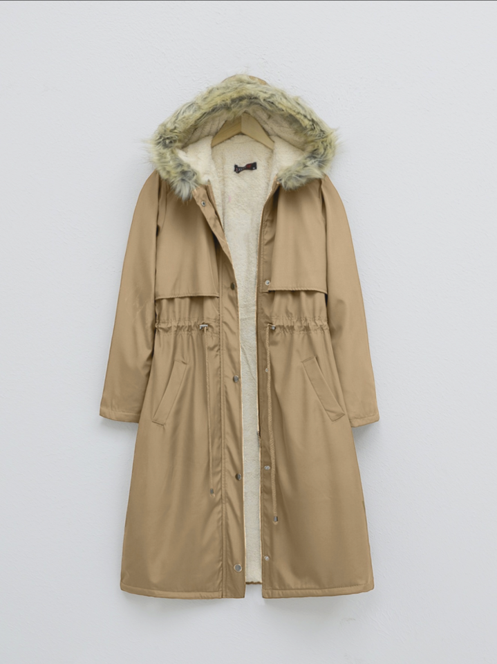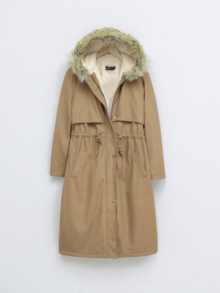 İçi Peluşlu Sabit Kapşonlu Tünel Bağcıklı Uzun Mont -Vizon
