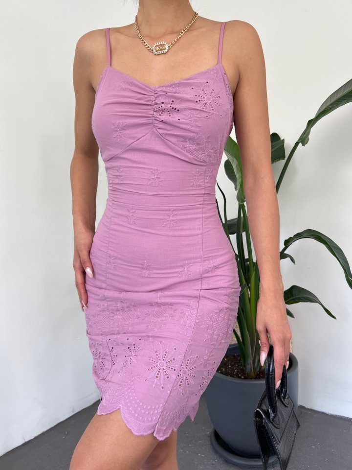 İp Askılı Fistolu Astarlı Mini Elbise -Vişne