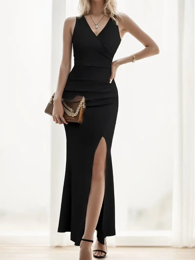 Kadın Askılı Kruvaze Yaka Yırtmaç Detaylı Janjan Krep Elbise