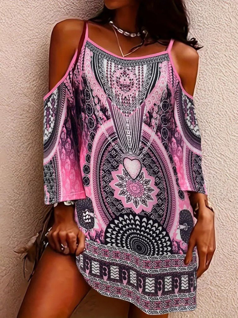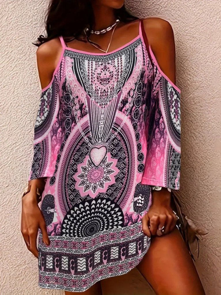 Kadın Askılı Omuzlardan Açık Truvakar Kol Desenli Kısa Süprem Elbise