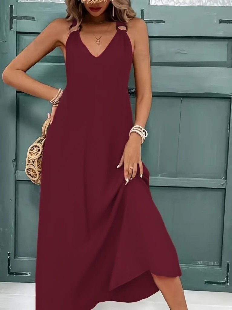 Kadın Askılı V Yakalı Halka Detaylı Maksi Boy Viskon Elbise