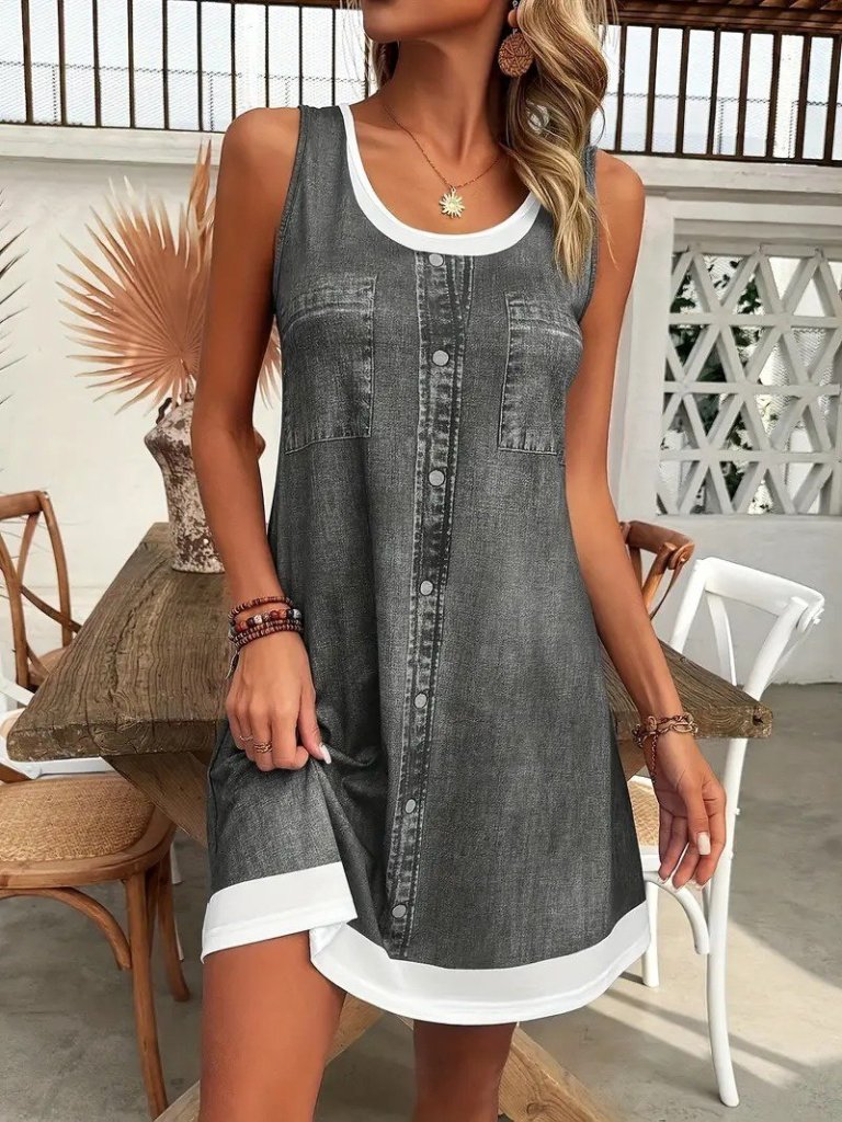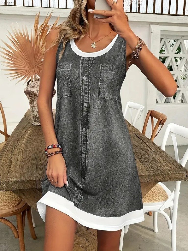 Kadın Askılı Yuvarlak Yakalı Kot Görünümlü Kısa Süprem Elbise