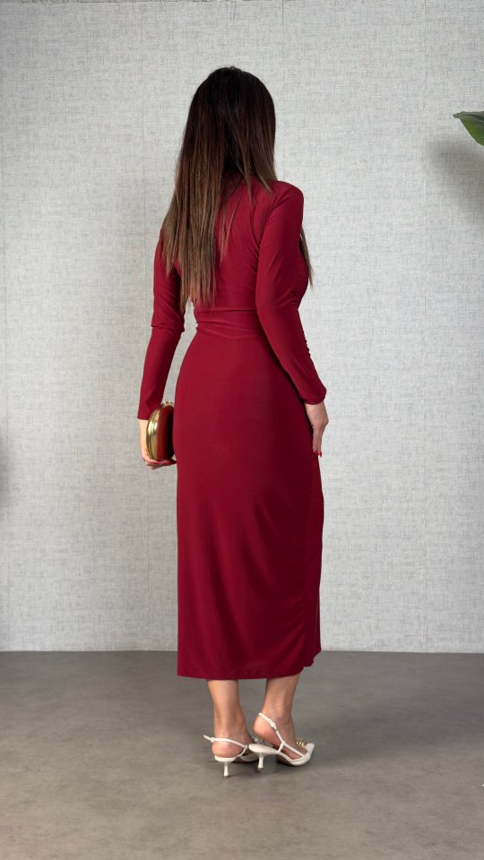 Kadın Uzun Kollu Kruvaze Yaka Büzgü Ve Balon Kol Detay Krep Kumaş Maxi Boy Elbise