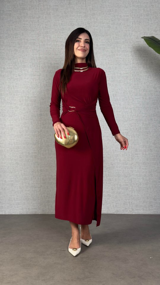 Kadın Balıkçı Yaka Toka Detay Sandy Kumaş Midi Boy Elbise