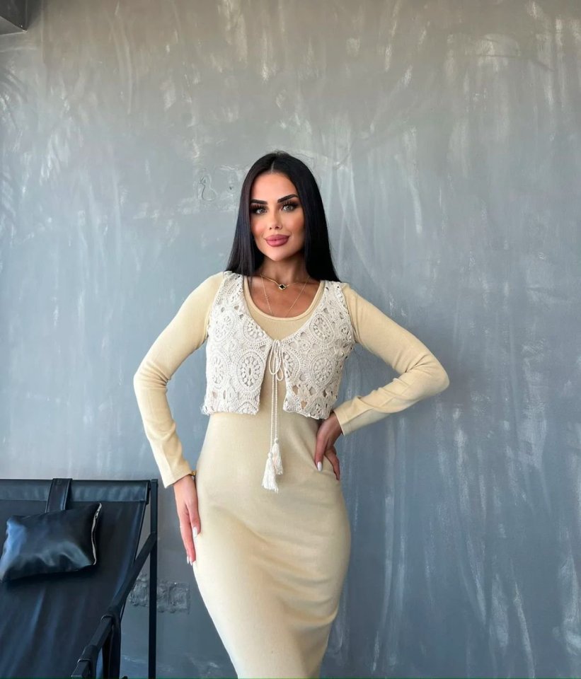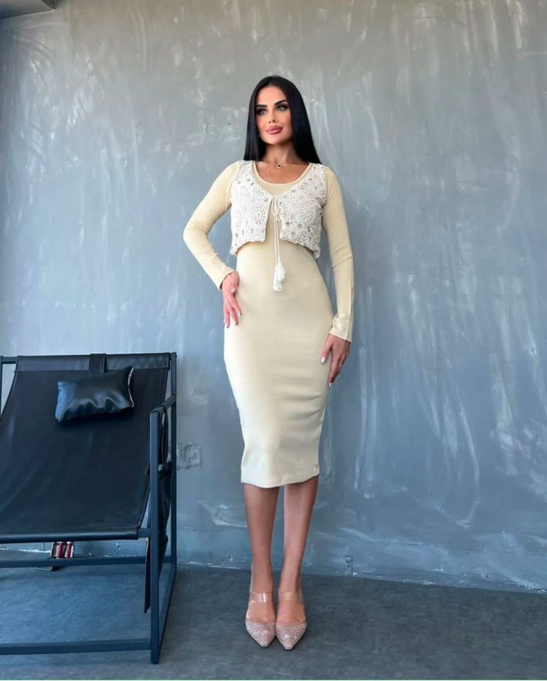 Kadın Bisiklet Yaka Midi Boy Elbise Ve Dantel Güpür Detay Yelek Fırsat ürün Ikili Takım