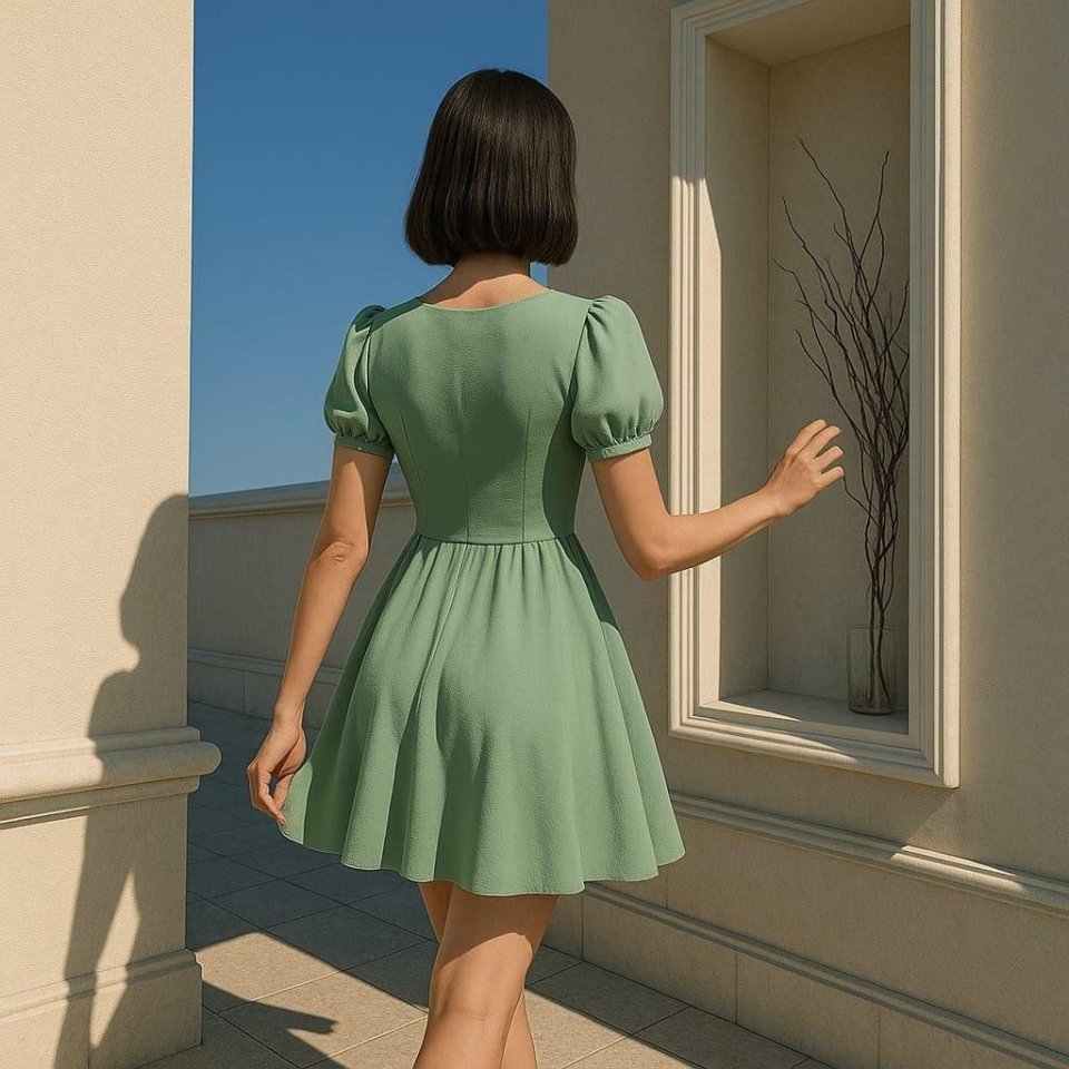 Kadın Kısa Kollu Yakası Açık Katlı Bürümcük Balon Elbise