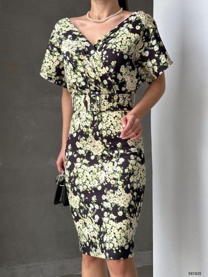 Kadın Dalgıç Kumaş V Yaka çiçek Desenli Kuşaklı Kalem Elbise