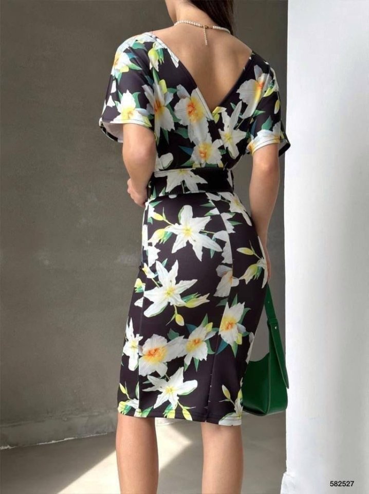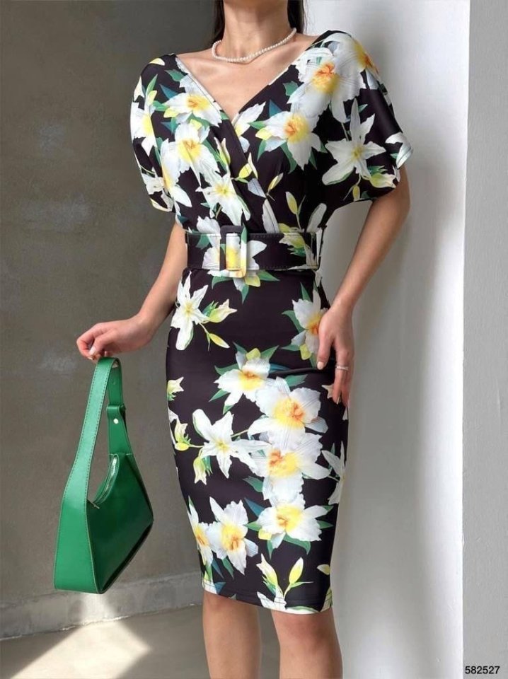 Kadın Dalgıç Kumaş V Yaka çiçek Desenli Kuşaklı Kalem Elbise