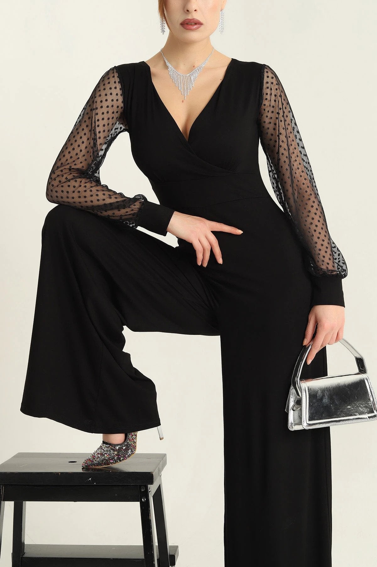 Kadın Derin V Yaka Kolları Puantiyeli Tül Detay Ispanyol Paça Tulum