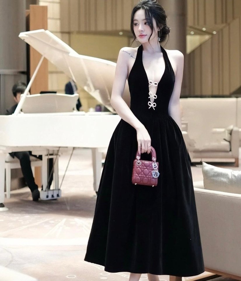 Kadın Askılı Degaje Yakalı Yırtmaçlı Kadife Midi Elbise