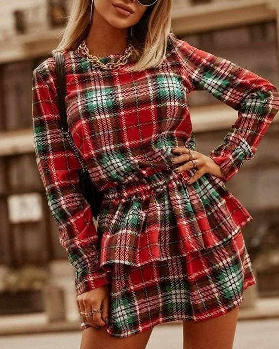 Kadın Ekose Kumaş Dijital Baskılı Uzun Kollu Mini Boy Elbise