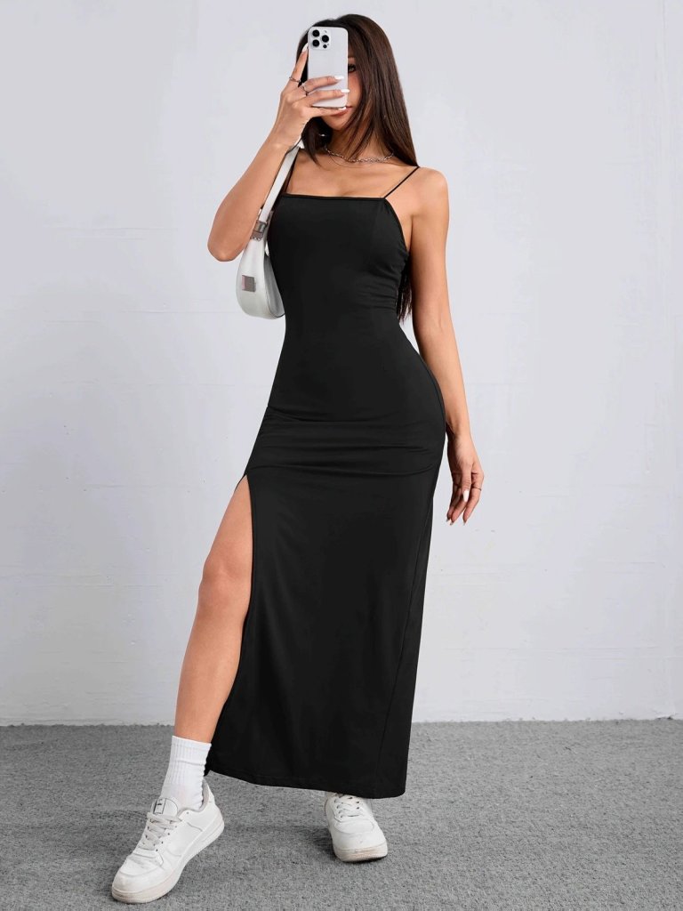 Kadın Ip Askılı Yandan Yırtmaçlı Janjan Krep Elbise