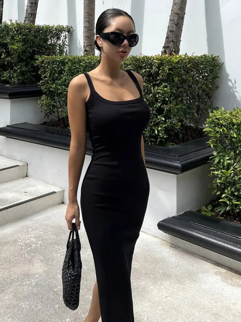 Kadın Ip Askılı Yuvarlak Yakalı Yırtmaçlı Midi Kaşkorse Elbise