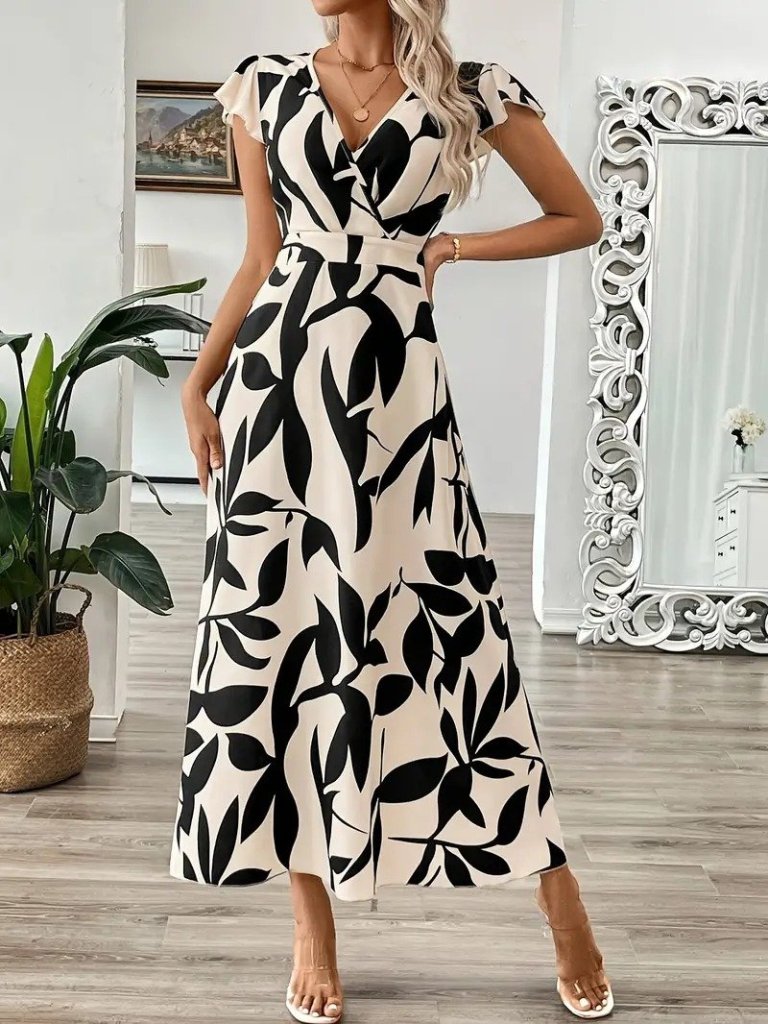 Kadın Kısa Kelebek Kollu Kruvaze Yaka Desenli Süprem Elbise
