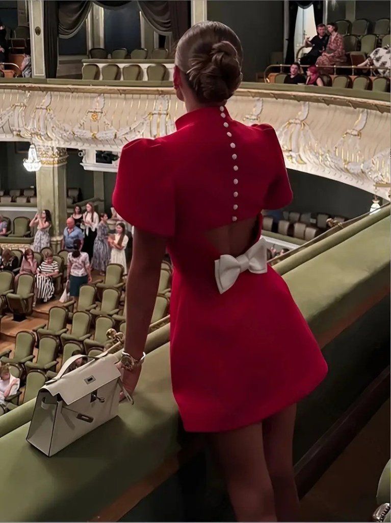 Kadın Kısa Kollu Balıkçı Yaka Arkadan Kelebek Dekolte Detaylı Kısa Atlas Elbise